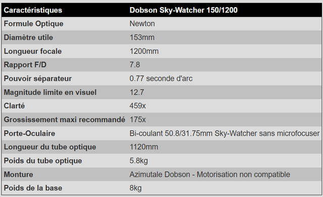 Le 150mm est le tout premier modèle de la gamme, permettant à tout le monde de s'initier à l'observation. Dans un ciel bien sombre vous pourrez découvrir vos premières nébuleuses ou amas globulaires (les objets les plus brillants du fameux catalogue Messier). Il vous sera possible de les localiser et pour la Nébuleuse d'Orion par exemple de voir de nombreux détails. L'été avec la majestueuse Voie Lactée (notre galaxie) vous pourrez contempler un maximum d'objets.