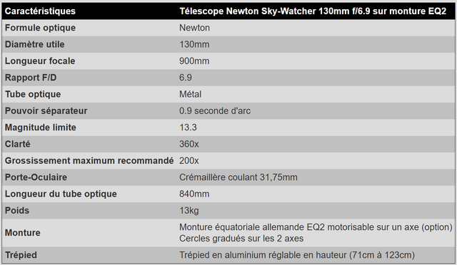 Avec un miroir primaire de 130mm le Newton 130 de Sky-Watcher récolte 30% de lumière en plus qu'un télescope de 114mm. Il promet aux débutants désirant investir dans un télescope à la fois lumineux, sans être coûteux, de nombreuses soirées d'observations riches de découvertes. En observation planétaire, il révélera à l'aide d'une Barlow ou d'un oculaire courte focale de nombreux détails sur Jupiter, Saturne et la Lune.